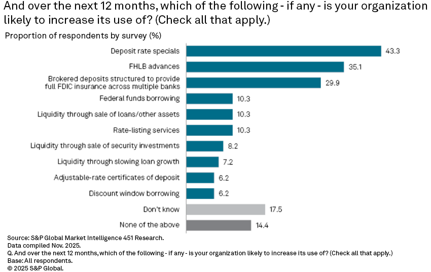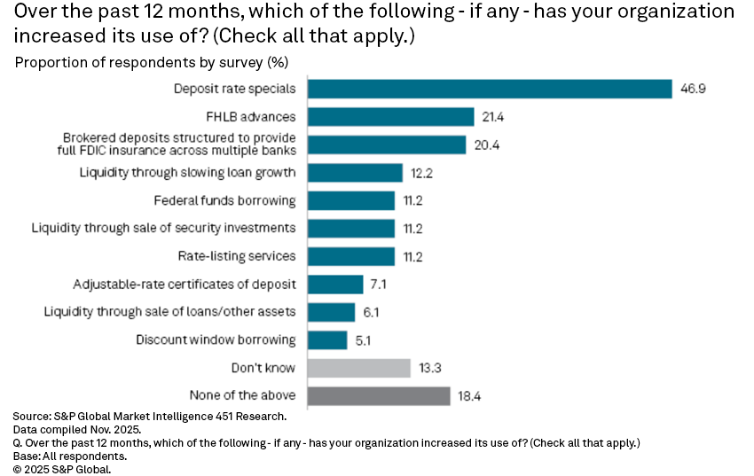 Among the respondents, 46.9% said that their organization had increased its use of deposit rate specials over the last 12 months, the highest percentage in any of the 10 options given for the question on liquidity and deposit sources. Meanwhile, 43.3% also projected that their institution would increase its usage of deposit rate specials over the next 12 months, up from 35.3% in the second-quarter survey.