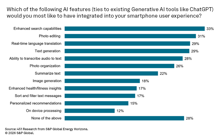 When we asked consumers which generative AI features they would most like to have integrated into their smartphone user experience (rather than as a separate app), enhanced search (33%), photo editing (31%), real-time language translation (29%), and text generation (29%) topped the list.