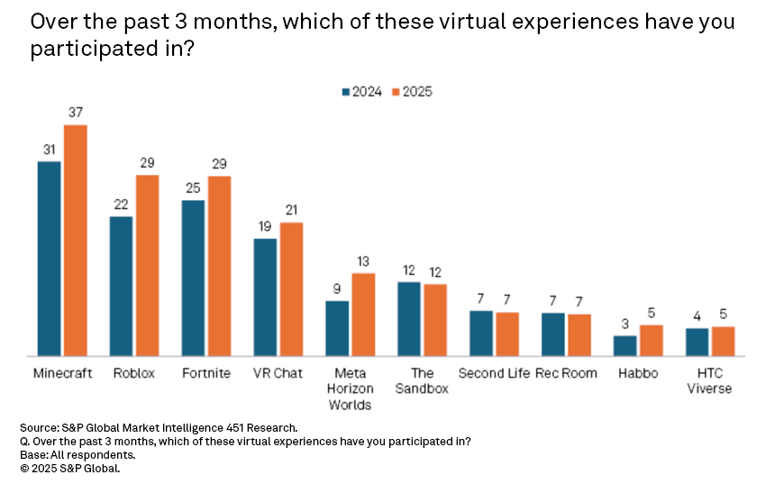 Our survey suggests new users are coalescing around the established venues in the metaverse: A significantly higher percentage of respondents reported using Minecraft, Roblox, Fortnite, VR Chat and Meta Horizon Worlds in 2025 compared to 2024.