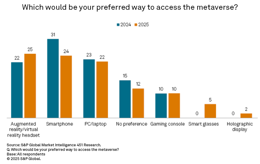 When we asked about the hardware users would most prefer to access the metaverse, AR/VR headsets became the top pick in 2025, with 25% of respondents. Smartphones and PCs/laptops were not far behind.