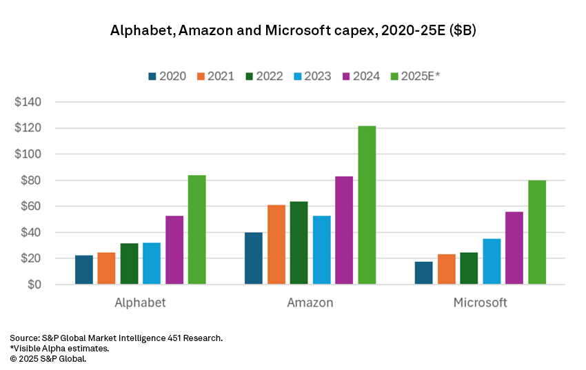 In February, Amazon.com Inc. said it planned to boost capex to more than $100 billion in 2025, after spending $83 billion in 2024. The increase was attributed to AI. In Q1 2025 earnings, AWS capex for the quarter ($24.3 billion) was slightly below that for Q4, but the firm noted that capacity constraints were impacting revenue, and that the firm is on track to spend $100 billion for the year. Furthermore, President and CEO Andy Jassy said, “As fast as we actually put the capacity in, it’s being consumed.” Q2 saw an even greater increase in capex to $31.4 billion. If this trend continues, capex will exceed the $100 billion estimate. In the latest earnings call, AWS CFO Brian Olsavsky said, “We will continue to invest more capital in chips, datacenters and power to pursue this unusually large opportunity that we have in generative AI. … AWS continues to be the primary driver as we invest to support demand for our AI services and increasingly in custom silicon, like Trainium, as well as tech infrastructure to support our North America and international segments.”