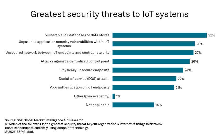 When survey respondents are asked to identify threats to IoT systems, the discussion quickly extends past IoT endpoints themselves. In a 2023 study conducted by S&P Global Market Intelligence 451 Research, the top cited IoT security threat was unpatched application security vulnerabilities, reflecting the difficulty of patching IoT and OT devices after they have been deployed. That dropped to second in 2024, superseded by attacks against a centralized control point, reflecting potential shifts in the behavior of threat actors. In our latest study, vulnerable IoT databases or data stores (32%) have risen to become the top concern. Unpatched application security vulnerabilities (28%) remain second, followed by attacks against unsecured networks between device endpoints and central control points (27%).