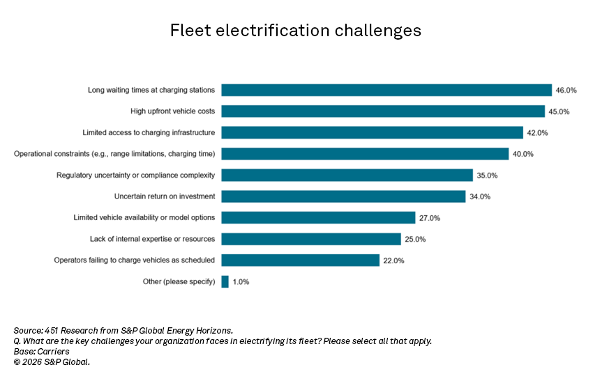 The bottleneck is readiness. Key challenges include long wait times at charging stations (46%), high up-front vehicle costs (45%), limited infrastructure access (42%), and battery range limitations (40%).